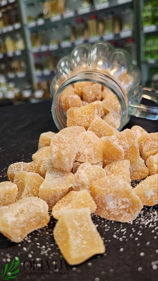 IMBIERAS CUKRUOTAS  –  pikantiškas, skanumynus pakeičiantis užkandis, o taip pat – puikus konditerinių kepinių ingredientas. SUDĖTIS:  Imbieras 55%,  cukrus 44,99 %. Kiekis: 150 gr. Kilmės šalis: Kinija