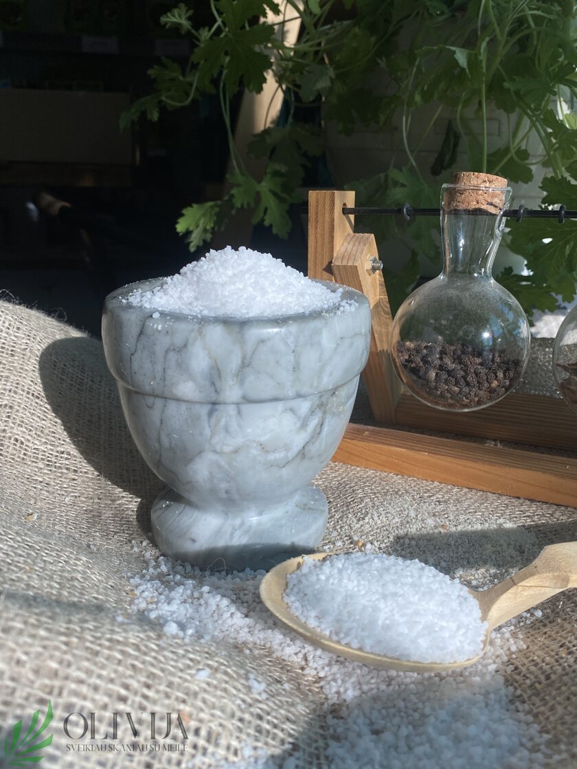 JŪROS druska   –  yra natūraliai išgaunama druska, gaunama iš jūros vandens garinimo proceso. Ji dažnai laikoma sveikesne alternatyva stambiai druskai, nes išlaiko daugiau mineralų ir mikroelementų.  SAVYBĖS:   Jūros druska turi įvairių mineralų, tokių kaip magnio, kalcio, kalio ir jodo, kurie gali būti naudingi organizmui. jI pasižymi švelnesniu skoniu nei stambi druska, todėl puikiai tinka įvairiems patiekalams. Manoma, kad jūros druska gali padėti reguliuoti skysčių pusiausvyrą organizme ir skatinti virškinimą. Dėl savo mineralų jūros druska dažnai naudojama vonioms ir kosmetikos gaminiams, pavyzdžiui, šveitikliams, nes gali padėti nuvalyti odą.Kai kurios jūros druskos rūšys turi mažesnį natrio kiekį, palyginti su stambia druska, todėl gali būti geresnis pasirinkimas žmonėms, kurie riboja natrio vartojimą. PANAUDOJIMO GALIMYBĖS:  naudojama kaip prieskonis patiekaluose, pavyzdžiui, mėsos, žuvies, daržovių ir salotų marinatuose, dedama ant patiekalų ir kaip dekoratyvinis ir skonio priedas. Dažnai naudojama vonioms, kad atpalaiduotų raumenis ir drėkintų odą. Jūros druska gali būti ingredientas šveitikliuose, padedanti nuvalyti negyvas odos ląsteles. Netradicinėje medicinoje jūros druska naudojama inhaliacijoms – kvėpavimo takų gydymui, siekiant palengvinti užgulimą. Kilmės šalis: