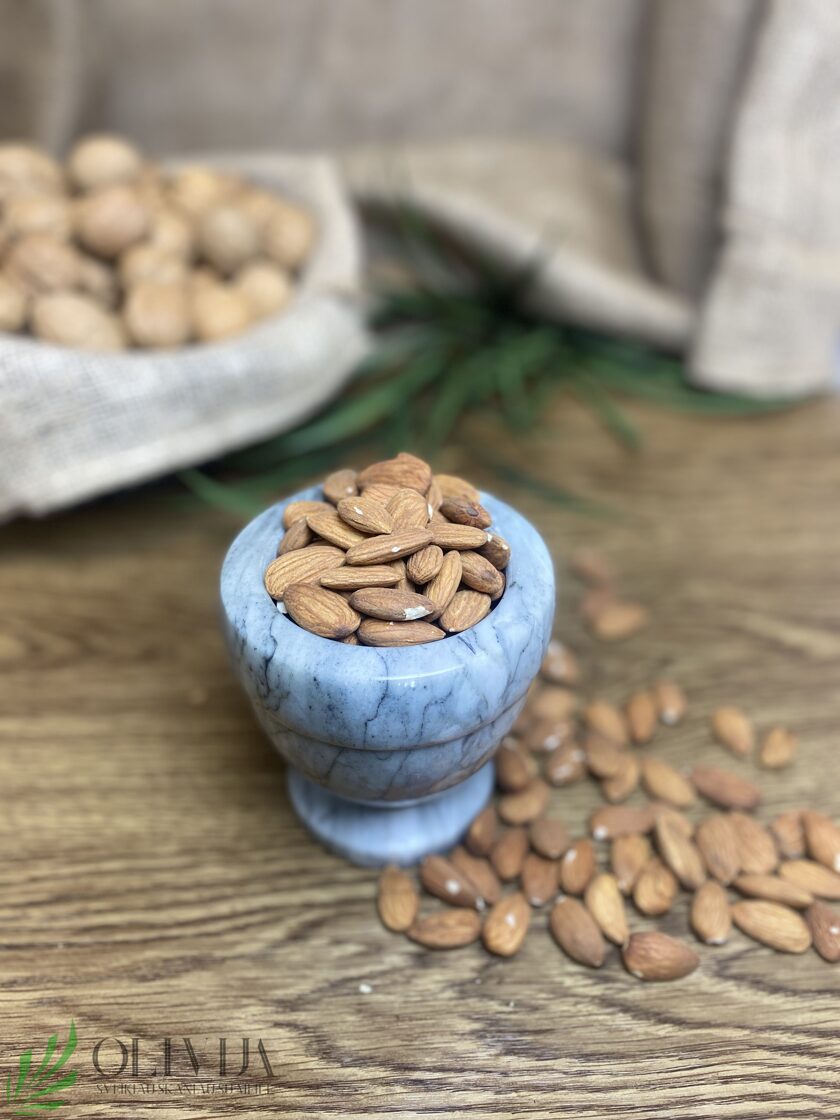 MIGDOLŲ RIEŠUTAI – traškūs džiovinto migdolo riešutai su odele, malonaus skonio,tai puikus produktas pilnavertei mitybai. SAVYBĖS: gausu vitamino E, taip pat B2, kalcio, magnio, vario, cinko geležies, baltymų, skaidulų kas itin teigiamai veikia plaukus ir odą, padeda išlaikyti gerą atmintį, saugo nuo išsękimo. Riešutai teigiamai veikia normalizuojant cholesterolio kiekį kraujyje, tinkami vartoti širdies ligų profilaktikai. Tinka vartoti diabetu sergantiems. PANAUDOJIMO GALIMYBĖS: vartojami kulinarijoje, salotoms, košėms, varškei, kokteiliams gardinti, užtepėlėms ir augaliniam pienui ruošti. DŽIOVINTUOSE VAISIUOSE, RIEŠUTUOESE AR UOGOSE mikroelementų koncentracija palyginti su šviežiais, yra keliskart didesnė, nes, kad gautume tiek pat mineralinių medžiagų, šviežių vaisių reikėtų suvalgyti net kelis kilogramus, todėl džiovinti, vaisiai, uogos – geras pasirinkimas norint praturtinti mitybą vitaminais. Džiovinant vaisius ir uogas išgaruoja vanduo, o visos kitos žmogui itin reikalingos medžiagos išlieka. Kilmės šalis: Ispanija