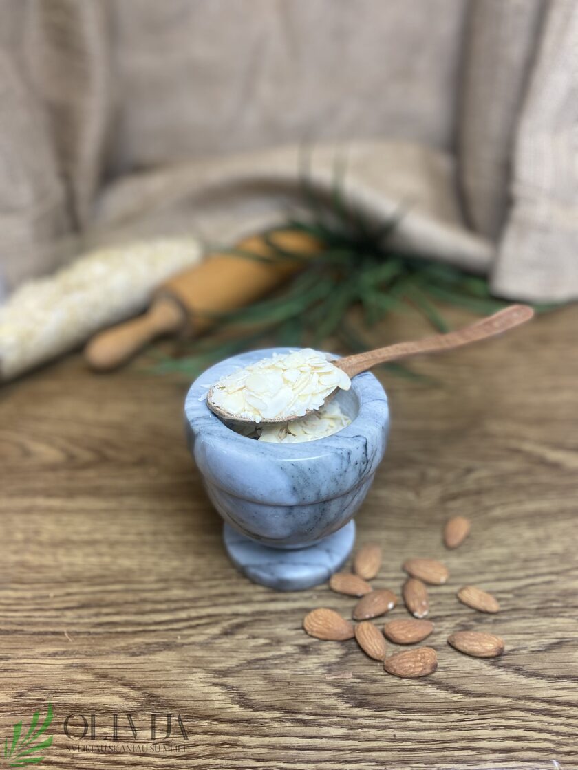 MIGDOLŲ SKILTELĖS – džiovinto migdolo riešuto skiltelės be odelės itin plonos, malonaus skonio, puikius produktas pilnavertei mitybai. SAVYBĖS: gausu vitamino E, taip pat B2, kalcio, magnio, vario, cinko geležies, baltymų, skaidulų kas itin teigiamai veikia plaukus ir odą, padeda išlaikyti gerą atmintį, saugo nuo išsękimo. Riešutai teigiamai veikia normalizuojant cholesterolio kiekį kraujyje, tinkami vartoti širdies ligų profilaktikai. Tinka vartoti diabetu sergantiems. PANAUDOJIMO GALIMYBĖS: vartojami kulinarijoje, salotoms, košėms, varškei, kokteiliams gardinti, užtepėlėms ir augaliniam pienui ruošti. DŽIOVINTUOSE VAISIUOSE, RIEŠUTUOESE AR UOGOSE mikroelementų koncentracija palyginti su šviežiais, yra keliskart didesnė, nes, kad gautume tiek pat mineralinių medžiagų, šviežių vaisių reikėtų suvalgyti net kelis kilogramus, todėl džiovinti, vaisiai, uogos – geras pasirinkimas norint praturtinti mitybą vitaminais. Džiovinant vaisius ir uogas išgaruoja vanduo, o visos kitos žmogui itin reikalingos medžiagos išlieka. Kilmės šalis: JAV