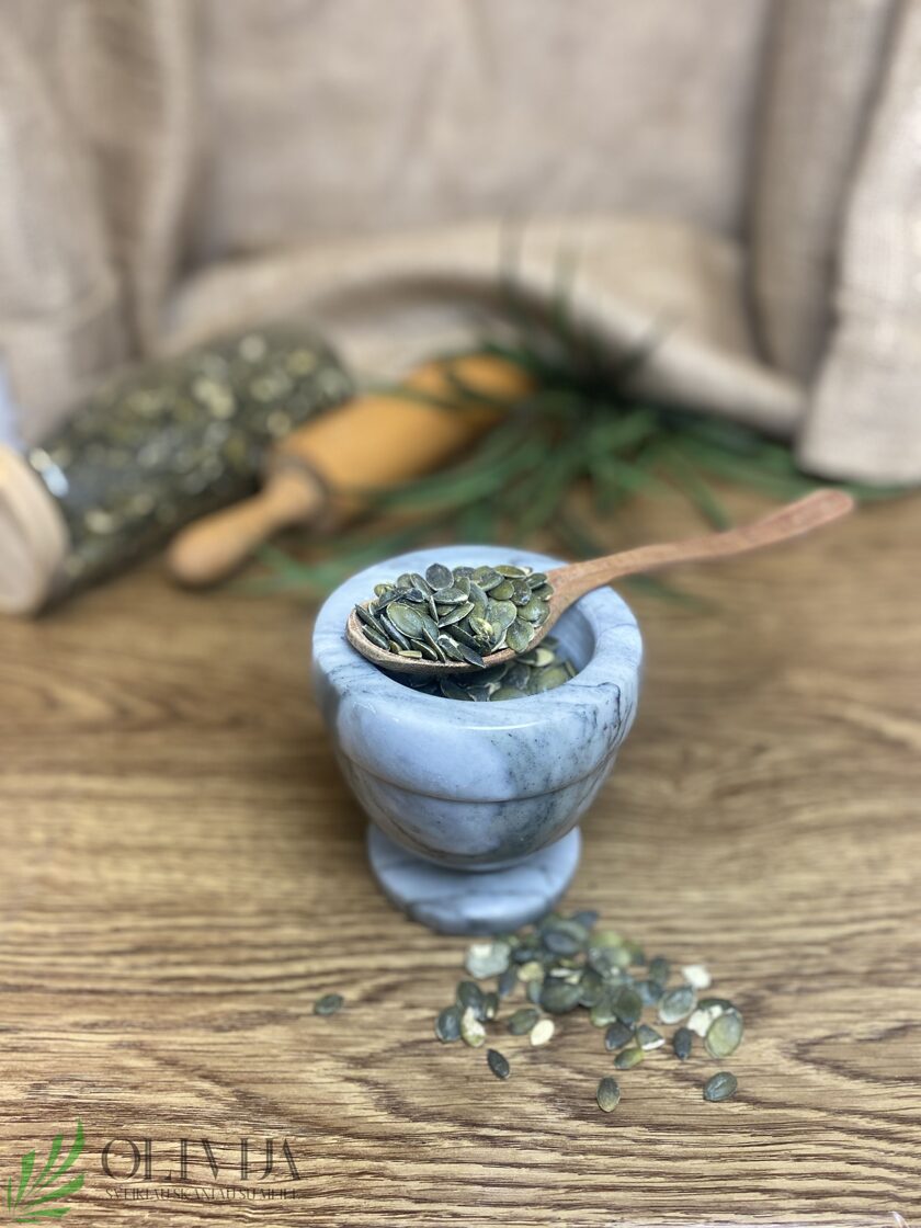 MOLIŪGO sėklos l – lukštentos, yatingo, riešutus primenančio skonio ir naudos sveikatai puikus derinys. SAVYBĖS: baltymų, omega 3 riebalų rūgščių, magnio, ląstelienos, cinko šaltinis. Kas palaiko kaulų sveikatą, gali padėti reguliuoti kraujo spaudimą, cukraus kiekį kraujyje. Manoma, jog būtent moliūgų sėklos padeda palaikyti vyriškų hormonų kiekį, palankiai veikia prostatą, saugo nuo ankstyvo plikimo. PANAUDOJIMO GALIMYBĖS: naudojamos gana plačiai, tinka košėms, sriuboms, salotoms, glotnučiams, kokteiliams, užtepėlėms, desertams ruošti ir puošti, kulinarijoje, vartojamos ir vienos žalios, ar skrudintos kaip sveikesnis užškandis. Sėklos gana kaloringos, todėl reikėtų vartoti saikingai. Kilmės šalis: Ne Es šalys, lietuva