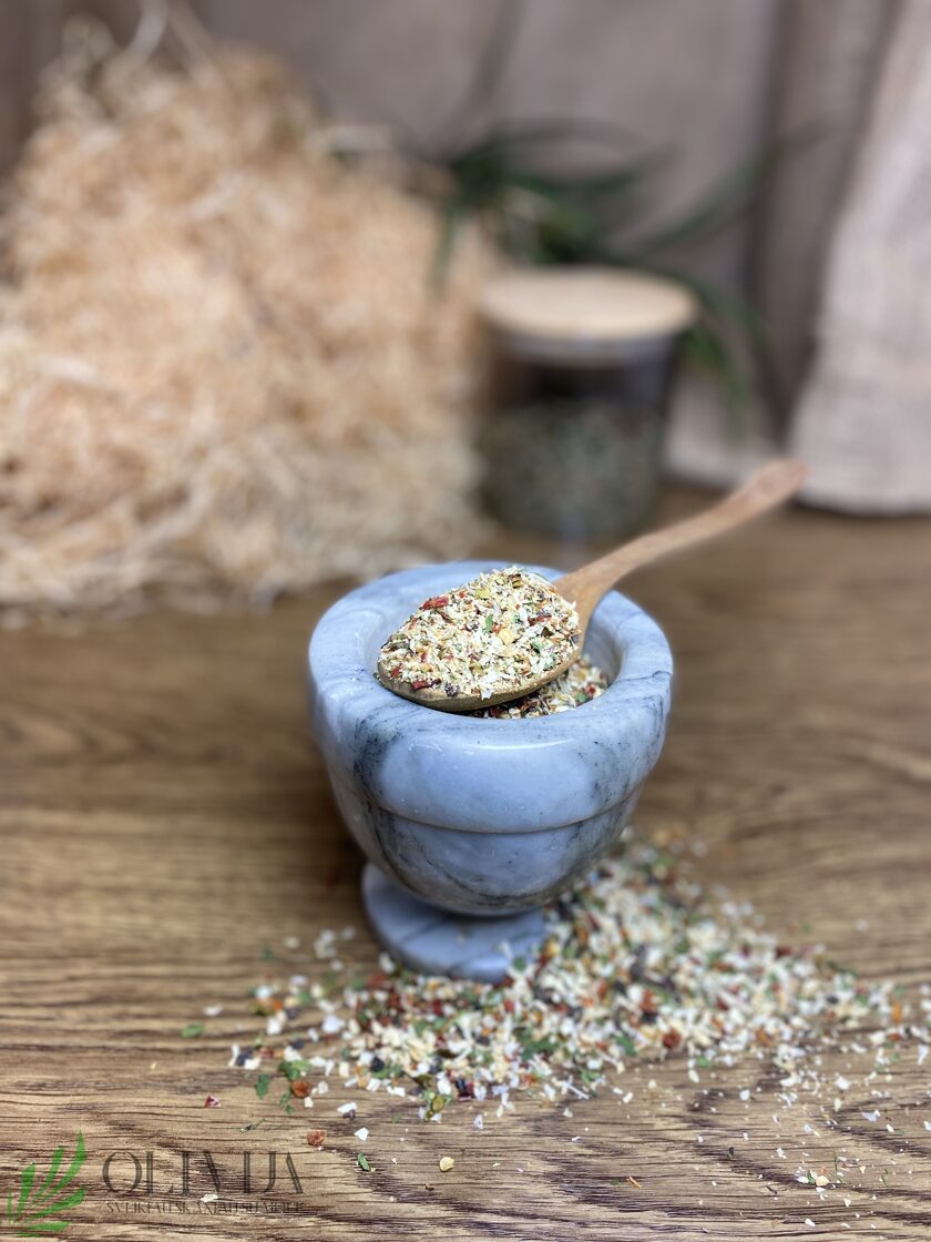 SU ALYVUOGĖMIS – ypatingo skonio, suderintas prieskonių mišinys nustebins savo aromatu ir skoniu, tinka netradicinio skonio gerbėjams – mėgaukitės naujais atradimais ! SUDĖTIS: česnakai, raudonosios ir žaliosios paprikos, svogūnai, džiovintos alyvuogės 10%, pomidorų granulės, raudonėliai, petražolių lapeliai, juodieji pipirai. ALIMYBĖS: puikiai dera su makaronais, koldūnais, tinka salotoms, picai, lazanijai, kiaušiniams gardinti. Kilmės šalis: Ne ES šalys
