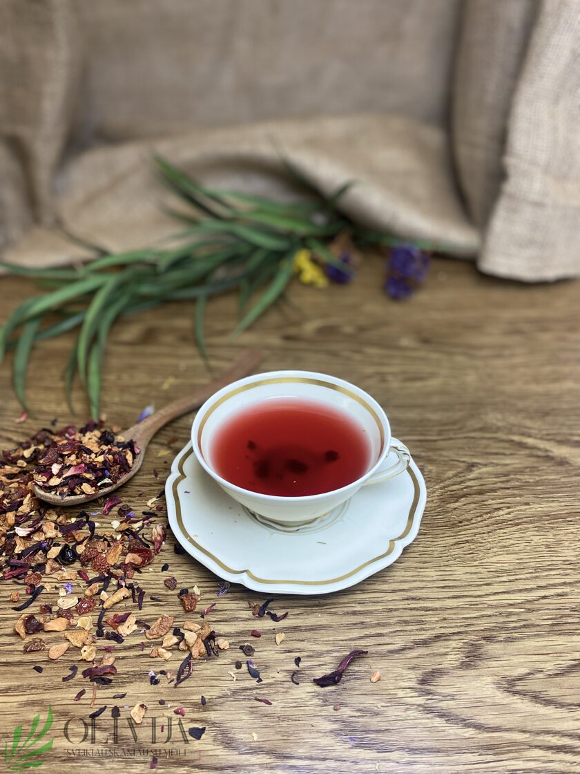 VAISINĖ – tikras vitaminų šaltinis, tai arbata, kurios pagrindą sudaro įvairūs džiovinti vaisiai, uogos, žiedai, žolelės ir prieskoniai. SUDĖTIS : kinrožė, erškėčių uogų luobelės, obuolių ir vyšnių gabaliukai, liofilizuotų aviečių ir braškių gabaliukai, kvapiosios medžiagos. PANAUDOJIMO GALIMYBĖS: Norėdami pasigaminti gėrimą – arbatą, tiesiog užpilkite 1–2 a. šaukštelius džiovintų ingredientų 250 ml. karštu vandeniu (apie 90-95 laipsnių) , kad skonis būtų švelnus ir neprarasti naudingų medžiagų. Tinka vartoti tiek karštą, tiek atvėsintą. Kiekis: 60 gr. Kilmės šalis: Ukraina